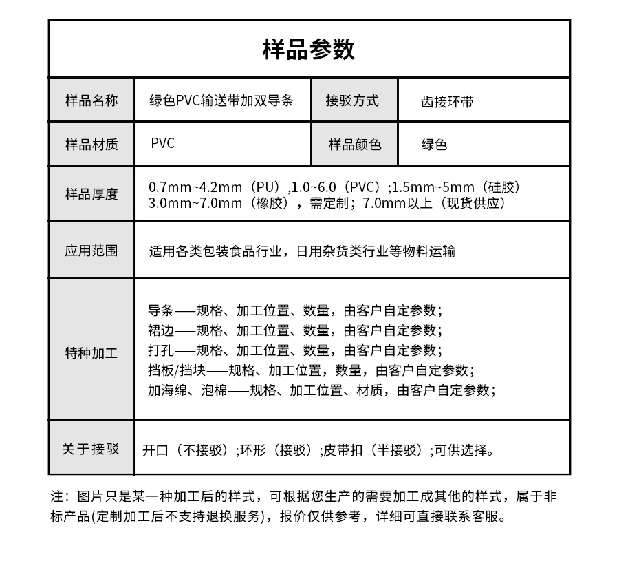 • 產品名稱:綠色PVC輸送帶加雙導條擎川食品輸送帶