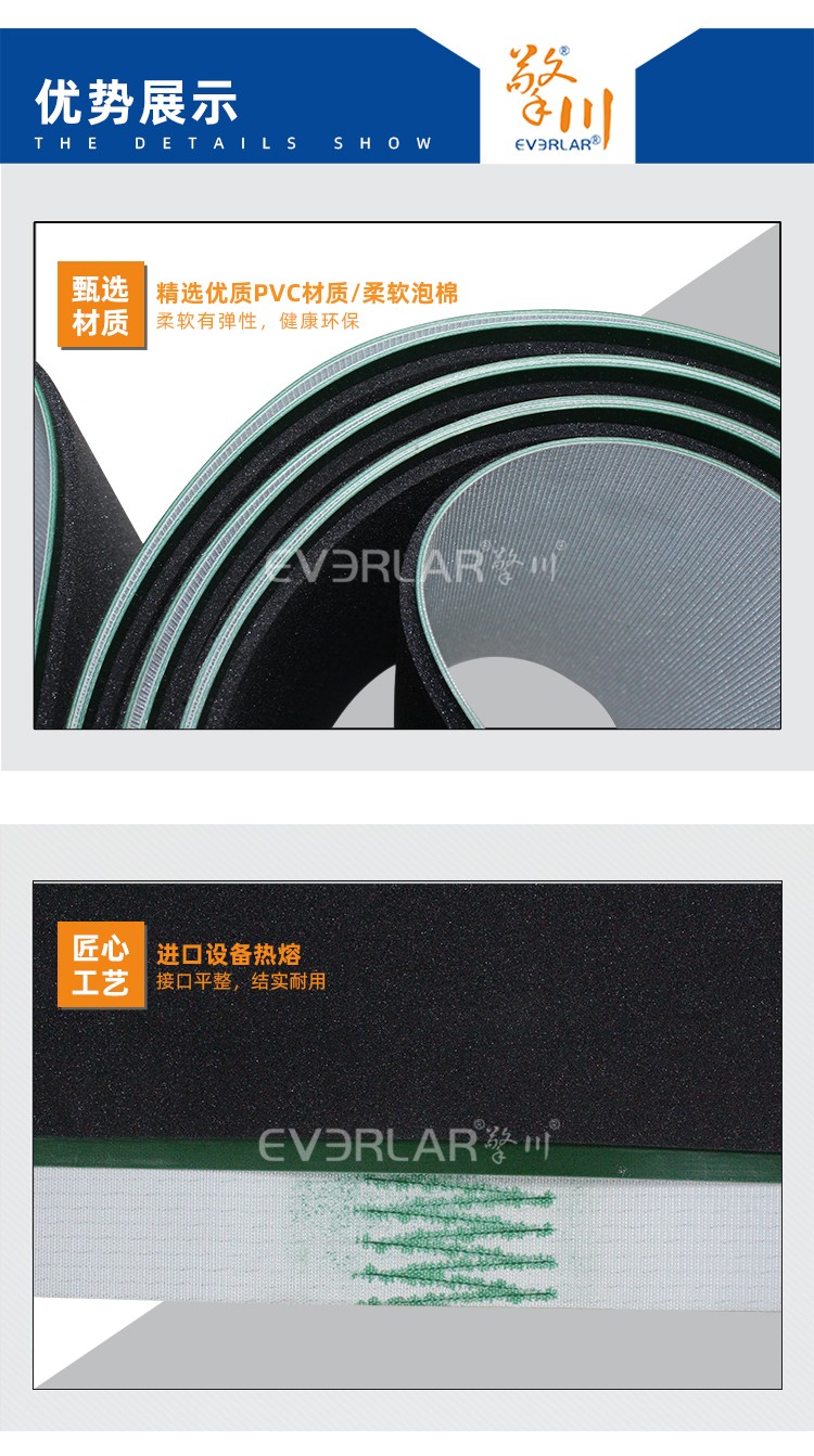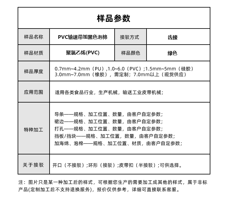 • 產(chǎn)品名稱:綠色PVC輸送帶加黑色泡棉耐磨耐腐蝕食品加工機械工業(yè)皮帶定制