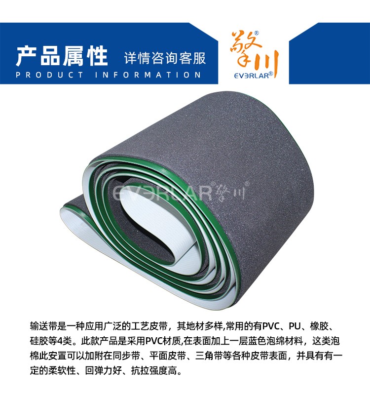 • 產品名稱:綠色PVC輸送帶加黑色泡棉耐磨耐腐蝕耐高溫工業(yè)皮帶定制