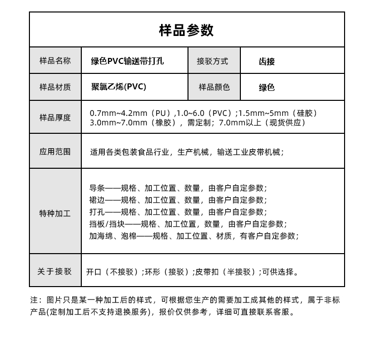 • 產(chǎn)品名稱:綠色PVC輸送帶加打孔耐磨耐腐蝕防靜電工業(yè)皮帶定制