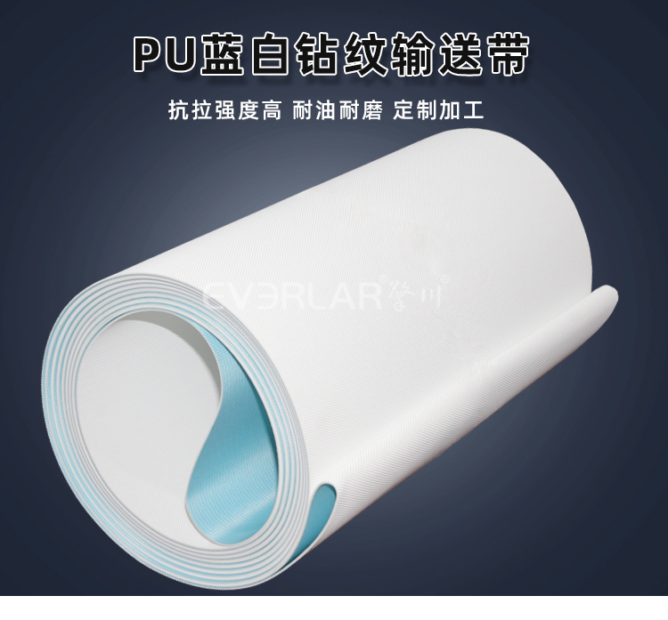 • 產(chǎn)品名稱:PU藍白鉆紋輸送帶耐磨耐油耐腐蝕工業(yè)皮帶定制