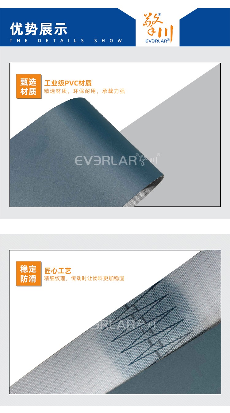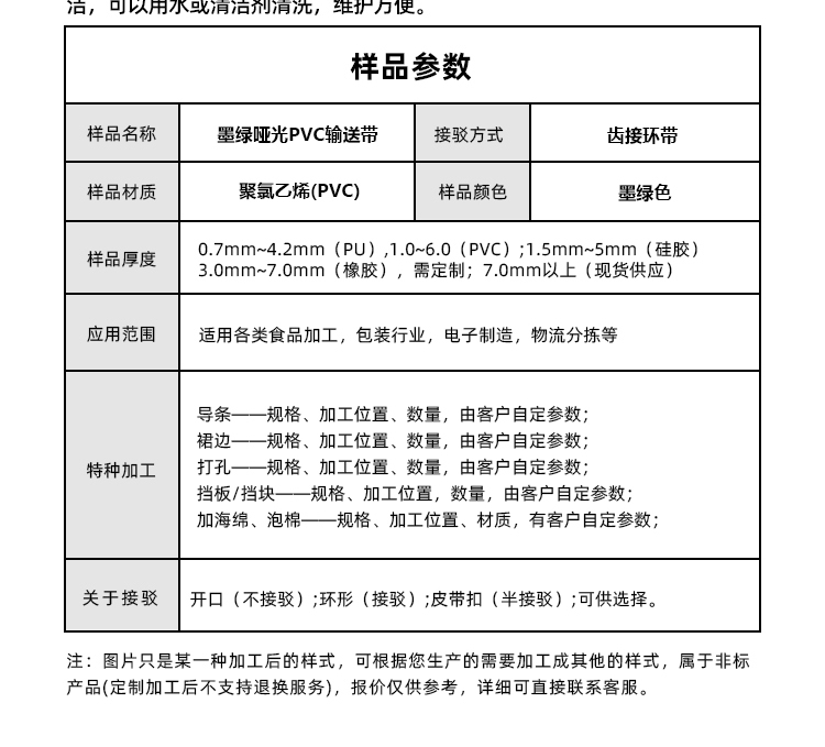• 產(chǎn)品名稱:墨綠啞光PVC輸送帶耐腐蝕防滑易清潔工業(yè)皮帶定制