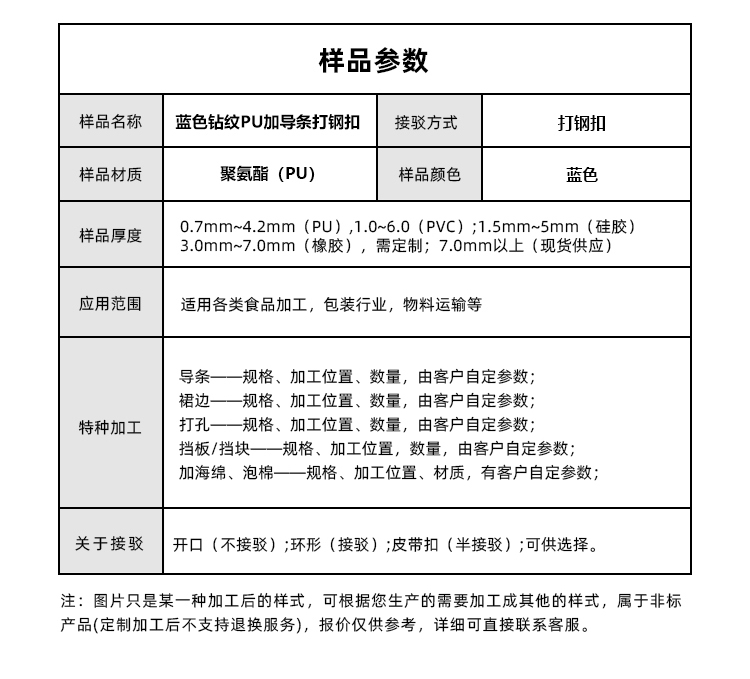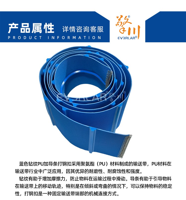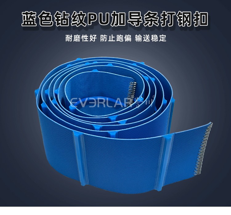 • 產(chǎn)品名稱:藍(lán)色鉆紋PU輸送帶加導(dǎo)條打鋼扣耐磨易清潔工業(yè)皮帶定制