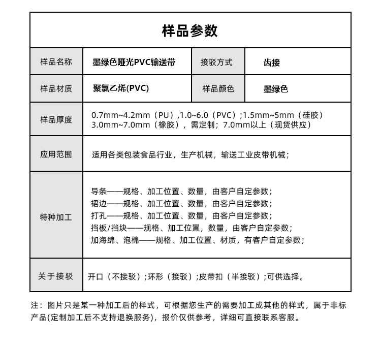產(chǎn)品名稱:墨綠色啞光PVC輸送帶加導(dǎo)條耐腐蝕防滑易清潔工業(yè)皮帶定制