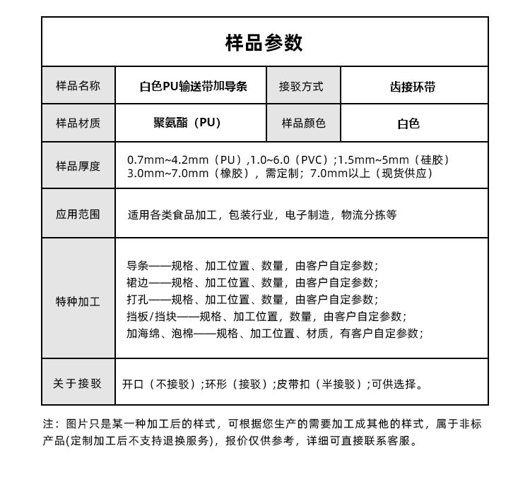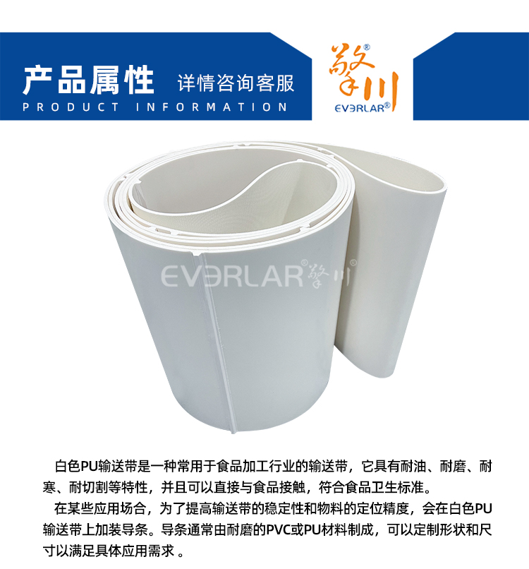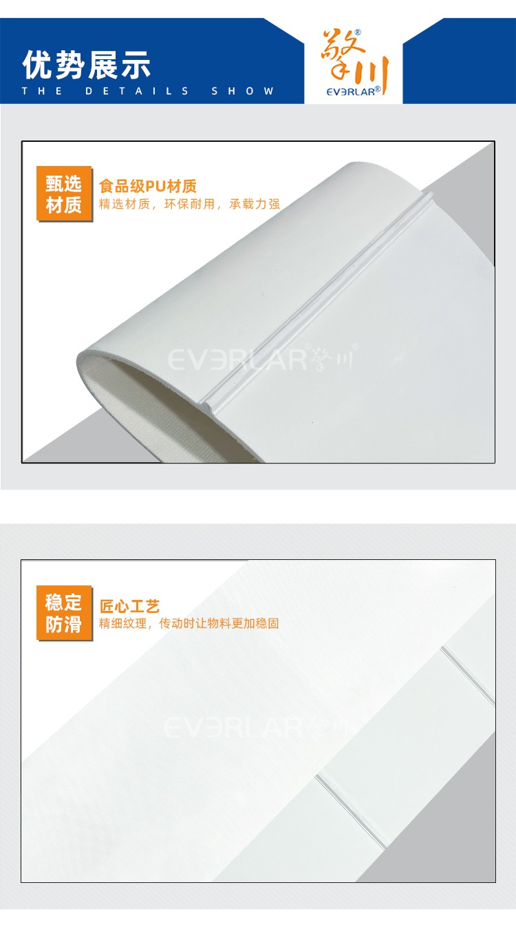 • 產(chǎn)品名稱:白色PU輸送帶加導(dǎo)條耐磨平穩(wěn)易清潔工業(yè)皮帶
