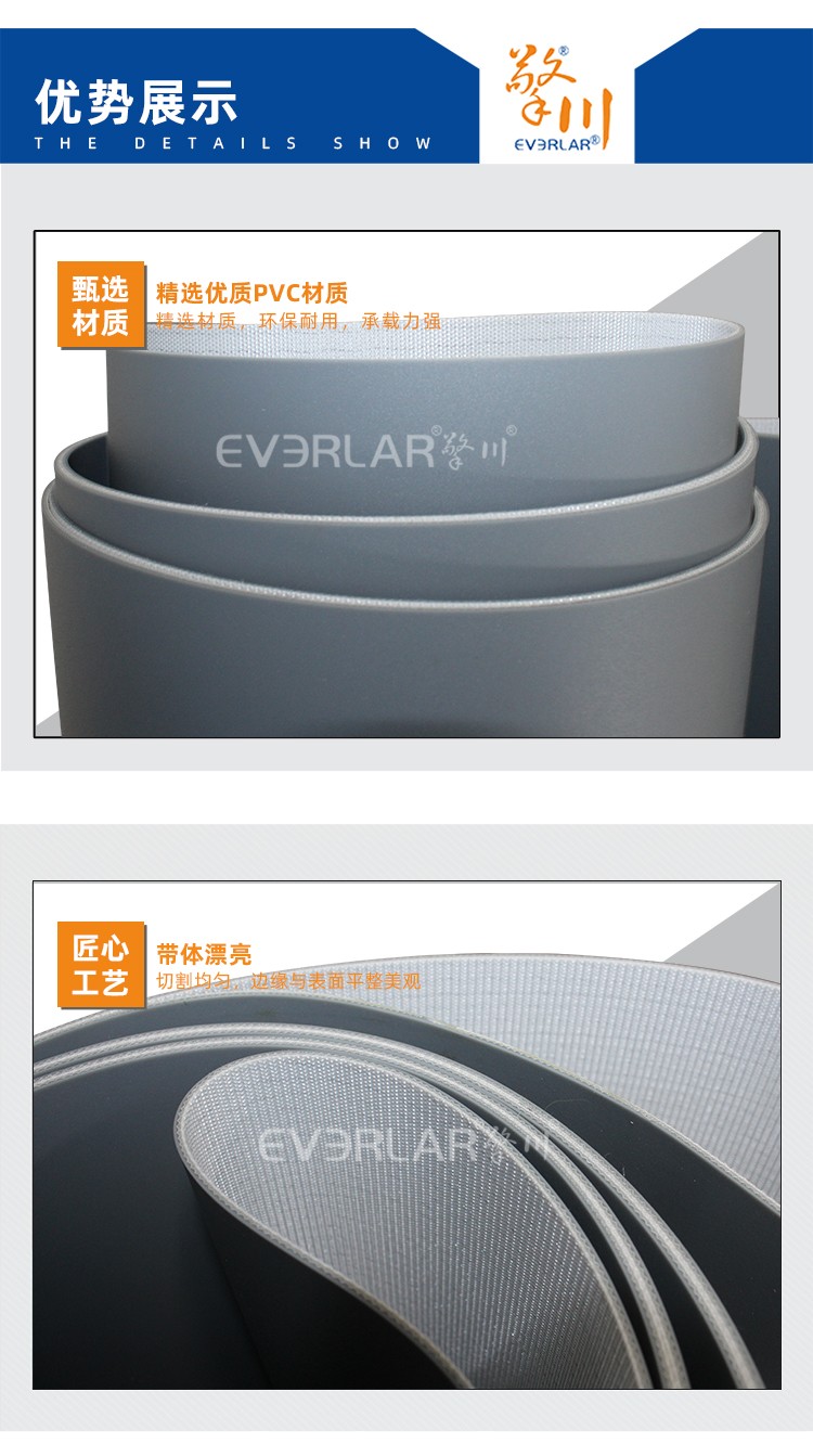 • 產(chǎn)品名稱:灰色PVC輸送帶耐磨平穩(wěn)耐腐蝕包裝機械工業(yè)皮帶定制