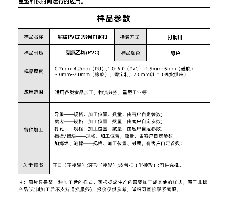 • 產(chǎn)品名稱:鉆紋PVC加導條打鋼扣耐磨平穩(wěn)防滑工業(yè)皮帶